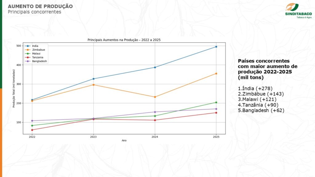 Os últimos três anos registraram um aumento significativo da produção de tabaco em países concorrentes do Brasil: Índia, Zimbábue, Malawi, Tanzânia e Bangladesh.